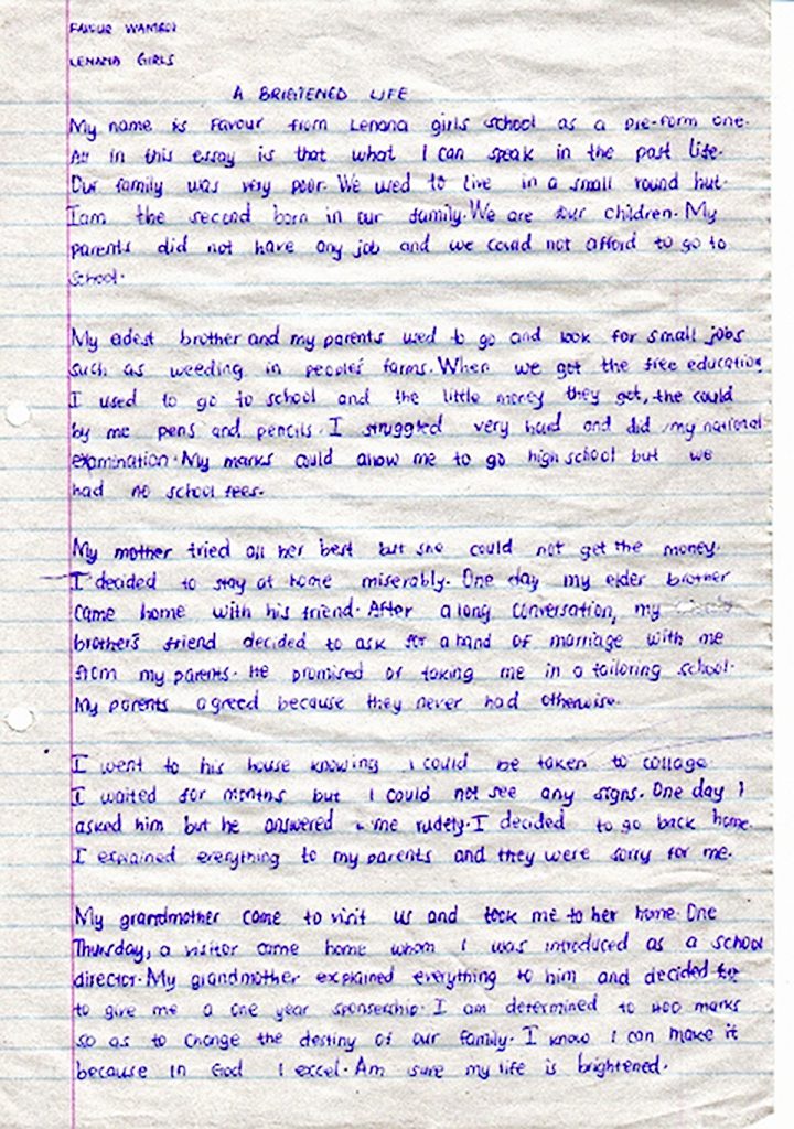 Favour entered her essay in Lenana’s First Annual Writing Competition sponsored by Lift the Lid and was awarded an Honorable Mention. In her story, we see how important going to school is to her, so much so that she entered into marriage at an early age for the promise of an education. But that isn’t the end of her story. In fact, it is just the beginning.