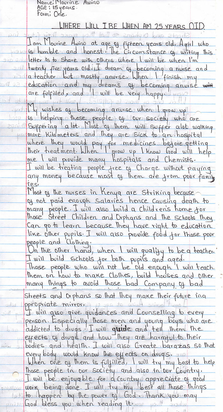 “My wish to become a nurse when I grow up is about helping these people of our society who are suffering a lot. Most of them will suffer from walking many kilometers, and they are sick in hospitals where they would pay for medicines before getting their treatment.” (Mourine)